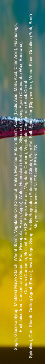 Sugar, Glucose Syrup, Modified Maize Starch, Wheat Starch, Vegetable Oil (Coconut, Palm), Modified Potato Starch, Acids (Lactic Acid, Malic Acid, Citric Acid), Flavourings, Fruit Juice from Concentrate (Grape, Pear, Pineapple, Peach, Apple), Water, Humectant (Sorbitols, Glycerol), Glazing Agent (Caranauba Wax, Beeswax), Colours (Curcumin, Brilliant Blue FCF, Paprika Extract, Vegetable Carbon), Vegetable Concentrate (Black Carrot, Spirulina), Corn Starch, Gelling Agent (Pectin), Invert Sugar Syrup, Acidity Regulator (Potassium Citrate), Palm Fat, Salt, Emulsifier (Diglycerides), Wheat Flour, Gelatine (Pork, Beef)