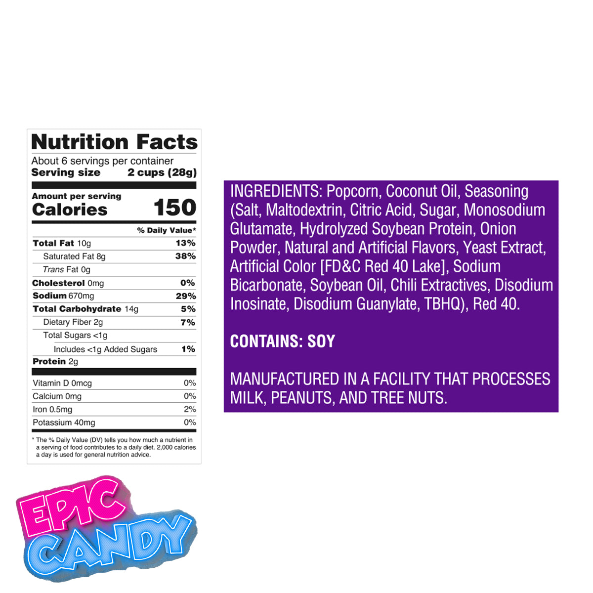 Popcorn, Vegetable Oil (Palm, Canola), Seasoning [Salt, Maltodextrin, Citric Acid, Hydrolyzed Soy Protein, Sugar, Flavourings, Yeast Extract, Onion Powder, Monosodium Glutamate (E621), Disodium Inosinate (E631), Disodium Guanylate (E627), Colour (E129, E133), Chili Pepper].