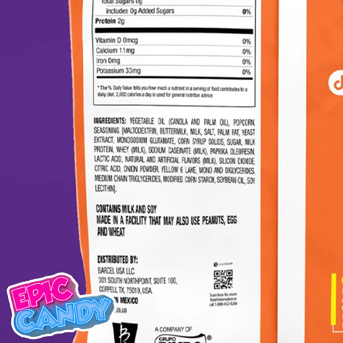 Popcorn, Vegetable Oil (Palm, Canola), Seasoning [Maltodextrin, Cheddar Cheese Powder (Milk), Whey, Salt, Citric Acid, Artificial Flavour, Yeast Extract, Onion Powder, Garlic Powder, Monosodium Glutamate (E621), Disodium Inosinate (E631), Disodium Guanylate (E627), Colour (E160c, E160b)].